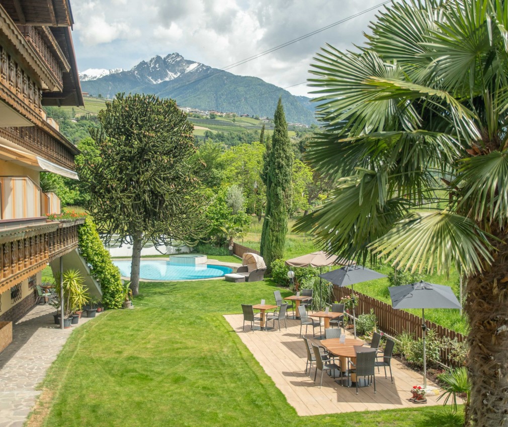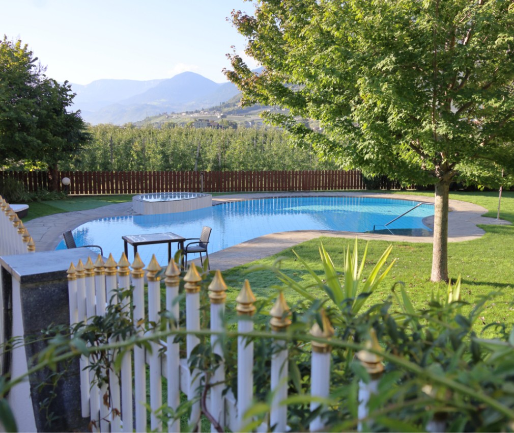 Für eine Erfrischung im klaren Nass sorgt das solarbeheizte Freibad mit Whirlpool und dem Blick auf die atemberaubende Berglandschaft des Meraner Landes.